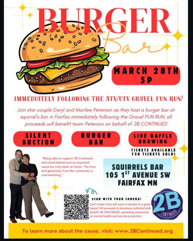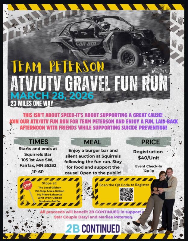 The ATV/UTV Fun Run begins with registration from 12:00–1:00 PM at Squirrels. The ride will start and end there, with a community meal and silent auction to follow. Registration is $40 per unit.