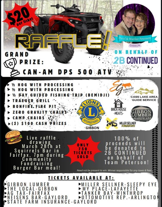 As part of this event, raffle tickets are available now for your chance to win an incredible lineup of prizes — including a Can-Am DPS 500 ATV, two half hogs with processing, a half-day guided fishing trip in the Bemidji area, a Traeger grill, fire pit, zero gravity chairs, camp chairs, and two $100 cash prizes.