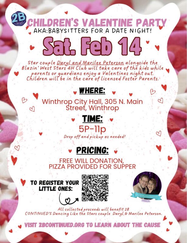 Gibbon, MN couple Daryl & Marilee Peterson will be offering parents a night out this Valentine’s Day. This star couple for 2B CONTINUED’s Dancing Like the Stars gala is raising money for mental health awareness & suicide prevention. The Kid’s Valentine’s Party will be at the Winthrop City Hall. Pizza supper provided. Free will donation for babysitting and supper. Your child will be in good hands with the Petersons who are licensed foster parents. Additionally, they will be assisted by Junior Leaders of the Blazin’ West Stars 4-H club.