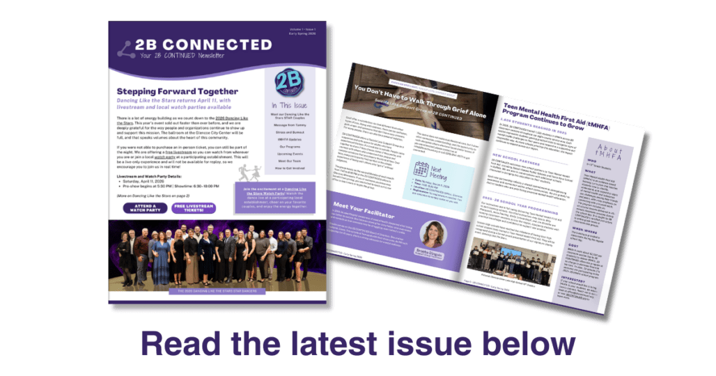 We’re excited to share the first issue of 2B CONNECTED, our new newsletter from 2B CONTINUED. It’s a way for us to stay connected with you and share a glimpse of the mental health and suicide prevention education and events happening in our communities.